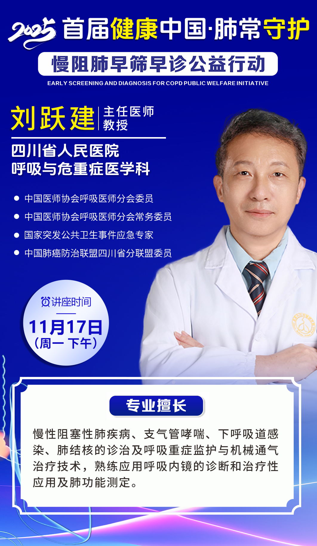 主讲人刘跃建主任,是四川省人民医院呼吸与危重症医学科的领军专家,深耕呼吸疾病诊疗领域数十年,对慢阻肺的早筛早诊、长期管理及并发症防控有着深厚造诣与丰富临床经验。讲座中,他将结合典型病例与权威数据,聚焦三大核心:一是解析慢阻肺的早期 “信号”,指导公众识别 “反复咳嗽咳痰、呼吸不顺畅” 等易被忽视的症状,避免延误诊治;二是深挖慢阻肺与肺癌的内在关联,明确慢性肺部炎症对肺癌发病的影响,强调规范管理慢病的防癌价值;三是针对高危人群与患者,给出可落地的健康管理方案,涵盖病情监测、生活方式调整、定期复查等关键环节。